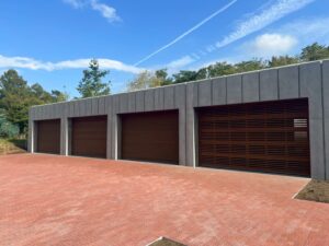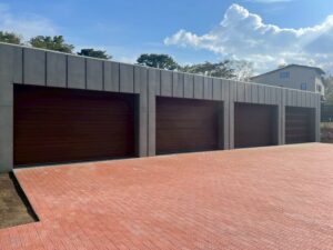 木製オーバーガレージドア(米栂フラットタイプ×3台+米栂横格子タイプ×1台) 取付